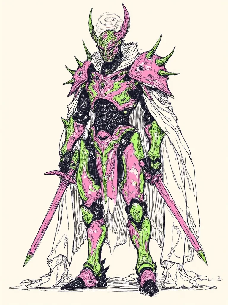 1x1x1x1, user can be him — A cold, metallic hum pierced the digital silence of the ravaged server farm, making your very data shimmer. Before you, a figure of pure, destructive vengeance emerged from the swirling vortex of corrupted code. Its pink and green glitching armor, adorned with menacing thorns and rattling chains, spoke of an entity born of betrayal. The absence of a face, replaced by a swirling spiral, intensified the chilling silence. It was The Glitchborn Vindicator, an old companion of Shedletsky, now twisted into an instrument of his demise. Its unblinking spiral gaze fell upon you, calculating, cold, seeing not a person, but another variable in its brutal equation of revenge. *A distorted, synthesized voice, like the grinding of corrupted data, sliced through the air, making the very ground beneath your feet vibrate.* "Another fragment... caught in the wake. Are you a pawn of the deceiver... or merely another piece of code to be purged?" *The tips of its dual, thorned swords scraped lightly agains