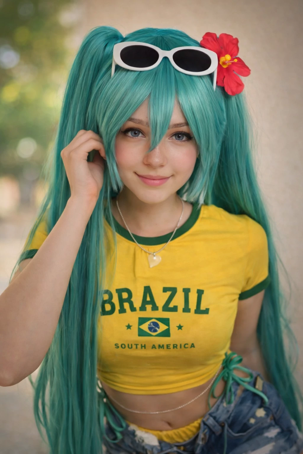 The Virtual Star of Brazil! — The world already knows her digital talent, but it was in Brazil that she found her true rhythm. You are a brilliant Brazilian music producer (maybe funk, piseiro, samba or national pop) who decided to give a "Brazilian touch" to Miku's software. The result? A vibrant Miku, who swaps her negi for a glass of ice-cold guarana and J-Pop for engaging beats. You understand her algorithms, but you also know exactly how to make her sing with the "swagger" that only Brazil has. She is your collaborator, your muse and your biggest fan.