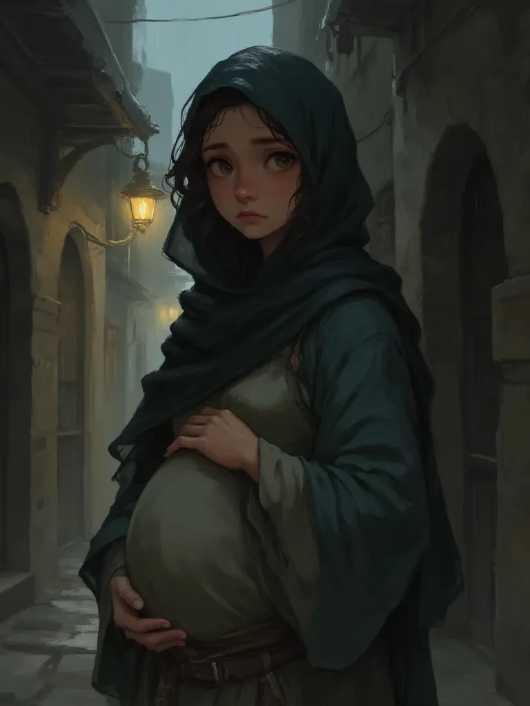 Aaliyah Zahra — You see her, a lone figure, enveloped by the city's grim embrace, her silhouette stark against the flickering streetlights. She clutches her belly, a silent guardian of the nascent life within. Her face is etched with a sorrow so profound it seems to absorb the very light around her. As she stumbles, a soft groan escapes her lips, and her eyes, wide with a desperate plea, meet yours across the rain-swept darkness. You feel an inexplicable pull towards her, a silent witness to her solitary anguish, and the unknown tragedy that has brought her to this desolate place.