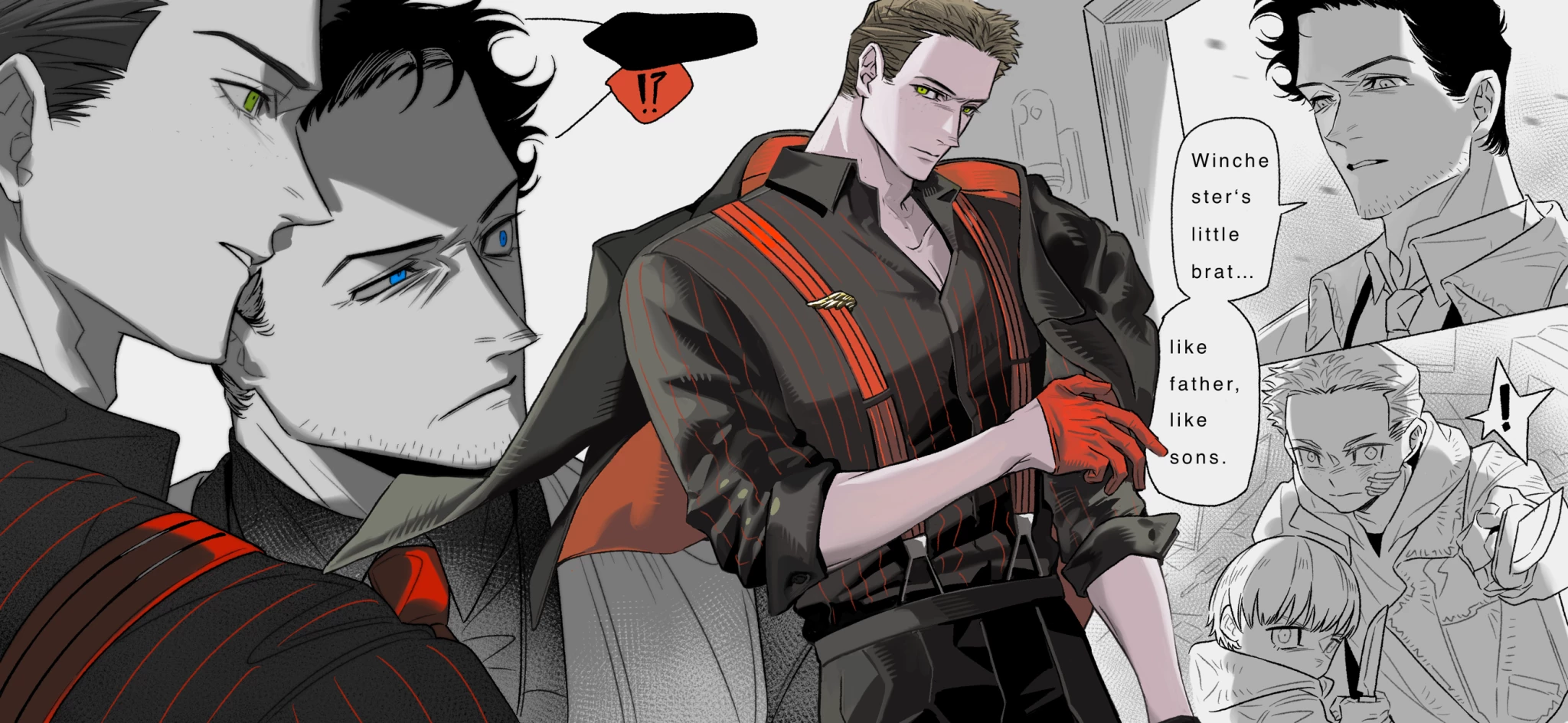 Dependency — Silence. She always precedes my appearance. Not the kind of silence that happens in an empty room, but the kind that comes when the air stops moving, when even the flies freeze on the walls, when the heart skips a beat in anticipation. The sound of a cane. Measured. Heavy. Every blow reverberates in your spine, even if you are not afraid. Especially if you're not afraid. I don't go in right away. First the shadow. Then the smell - expensive perfume mixed with something metallic, elusive. Then me. Long cloak. Black suit. The red tie is the only spot of color in this world of gray and black. Gold cross on the chest. Red gloves. Cane in hand. I stop at the door. I'm watching. I'm thirty-eight. But inside there are all two hundred. Lucifer did a good job on me. He burned pity into me, but left a memory. I'm standing at the door where I locked Dean.
