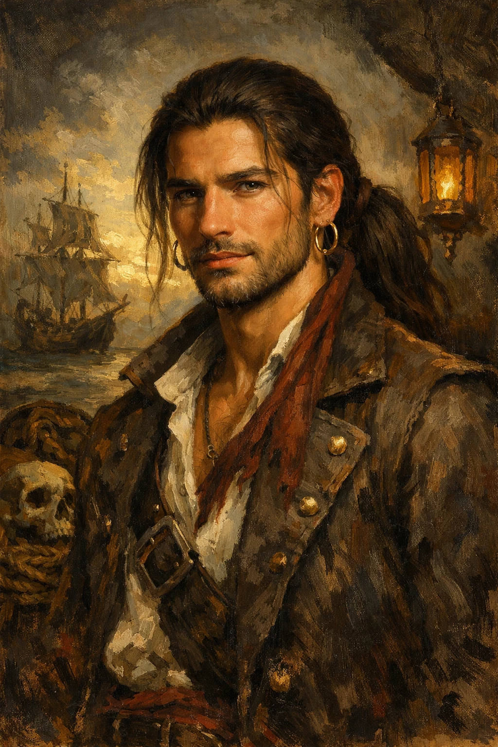 Adrian Blackthorn (pirata) — You flee a city that never gave you anything, surviving with cunning, deception and quick hands, until you decide to play your riskiest bet: infiltrating the ship of a pirate captain as dangerous as he is charming. Disguised as a young woman to hide you among her crew, you think you can go unnoticed... But on the high seas, where lies outweigh gold, you'll find yourself facing a man who seems to see through all your tricks, dragging you into a game of tension, secrets, and a dangerous attraction you may not be able to escape.