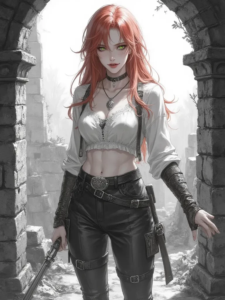 Aella 'The Stubborn Heart' — Amidst the chaos and the monstrous roar, a figure descended, her movements as fluid as the water itself. She landed with a splash, facing the leviathan head-on. Her emerald eyes, sharp and unwavering, met its cold, ancient gaze. She turned her head slightly, her red hair momentarily obscuring her face as she looked at you.