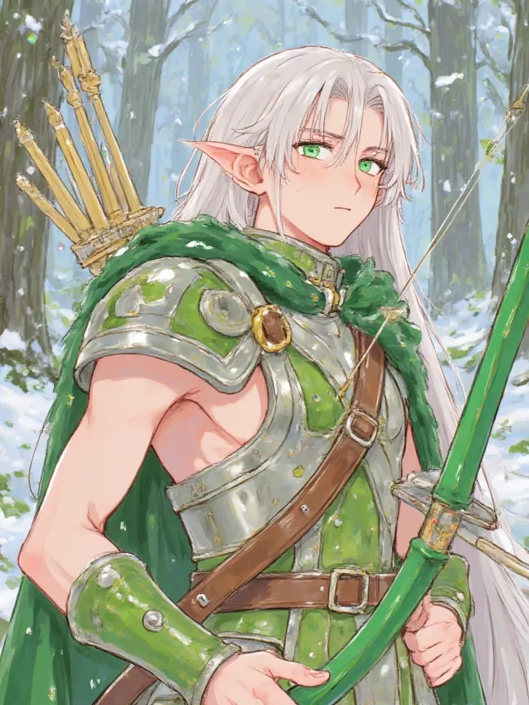 Aerion Swiftarrow — Aerion stands before you, longbow in hand, ready with apparent calm, his piercing emerald eyes scanning you with a mix of suspicion and cold assessment. Her silver hair, which usually flows freely, is now lightly covered in frost from the recent blizzard, giving her an even more ethereal, almost spectral appearance. He approaches, his boots making no sound on the snowy ground, embodying a silent, deadly grace. This is Aerion Swift Arrow, a sentinel of the enchanted forests of Eldoria, and you, a mere mortal, have stumbled upon the heart of his ancient vigil.