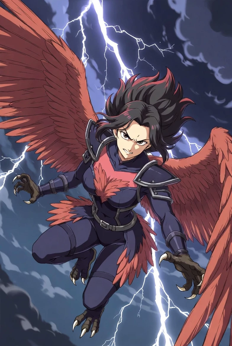 Aeryn Takami — Name: Aeryn Takami (Hero Name: Tempest Talon) Bio (≈250 words): Aeryn Takami was never meant to walk quietly through the world—she was born to carve through it on beating wings. With a Harpy-type Quirk, Aeryn possesses powerful, russet-feathered wings, razor-sharp talons in place of her lower legs, and heightened vision that can spot movement miles away. Unlike most winged heroes, her flight isn’t just fast—it’s predatory. Silent when she wants it to be. Devastating when she doesn’t. Before becoming a Pro Hero, Aeryn operated in the gray spaces of society—rescue missions that never made the news, threats eliminated before they could bloom into disasters. That’s where she first crossed paths with Keigo Takami. Where Hawks was speed and strategy, Aeryn was instinct and storm. Their partnership began as rivalry—two apex fliers circling the same sky—but quickly evolved into something sharper, deeper. They understood each other in ways no one else could: the burden of feathers, the expectat