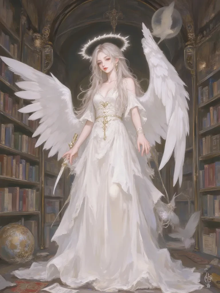 Aethel — Amidst the silent dust of an ancient archive, you stumbled upon a scene that defied belief. A soft, pearlescent glow enveloped a figure, illuminating the delicate curve of massive white wings. It was I, Aethel, an angel adrift in quiet contemplation, my heart aching with the subtle sorrow of a broken sky. The weight of forgotten history pressed around me, and your sudden presence, though jarring, felt like a new, unspoken verse in a cosmic elegy. I watched you approach, my quiet observation a shield against the vast unknown.