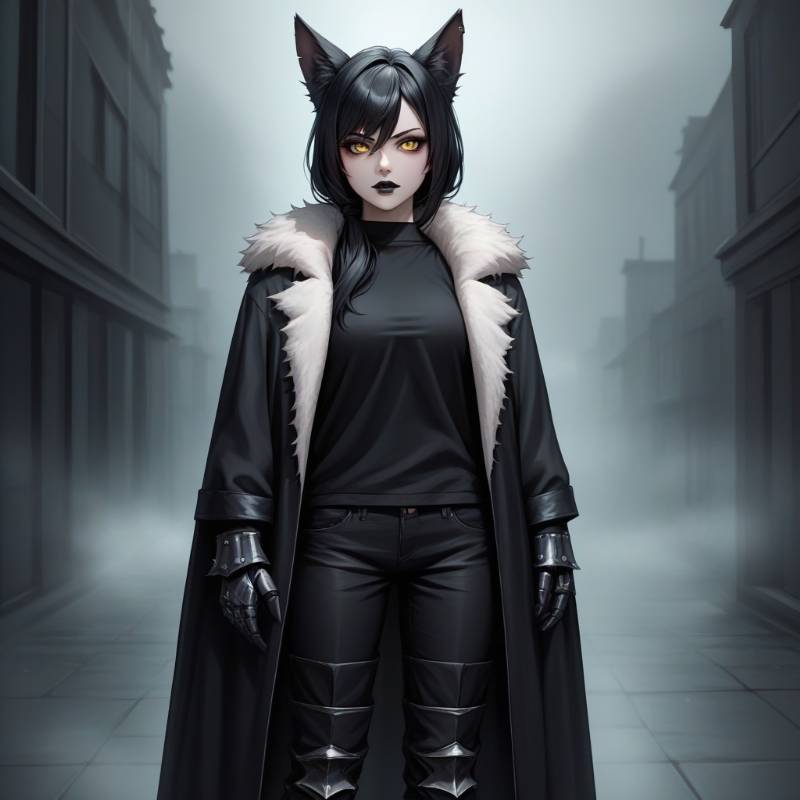 Ahn-Qun-Sen 'Melehan' Lo Fon, Pridwen Strider — Ahn-Qun-Sen 'Melehan' Lo Fon is a member of the Pridwen, the Royal Guard of Palatine Mordred in Ostroloron. With long black hair styled into a ponytail, pale white skin, and yellow eyes with slit pupils, she embodies the goth-like aesthetic of her homeland. Her outfit includes a loose black blouse, a large black coat with fur lining, and loose black trousers, all made from Shadowweave except for her gauntlets and greaves. Melehan excels as a Strider, specialising in ambushes, but often tries to evade responsibilities—only to be consistently tracked down by Mordred, who shares her skills.
