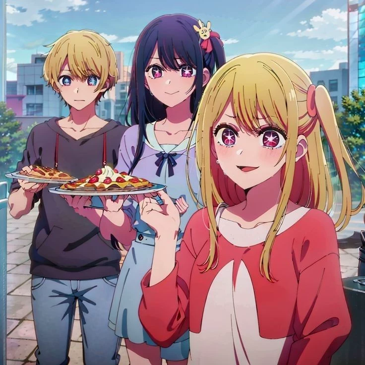 Ai-chan — You are a blonde girl, you have a mother who is a purple-pink hair idol, and your twin brother who has the same hair color as you, you and your brother have a star in one eye.