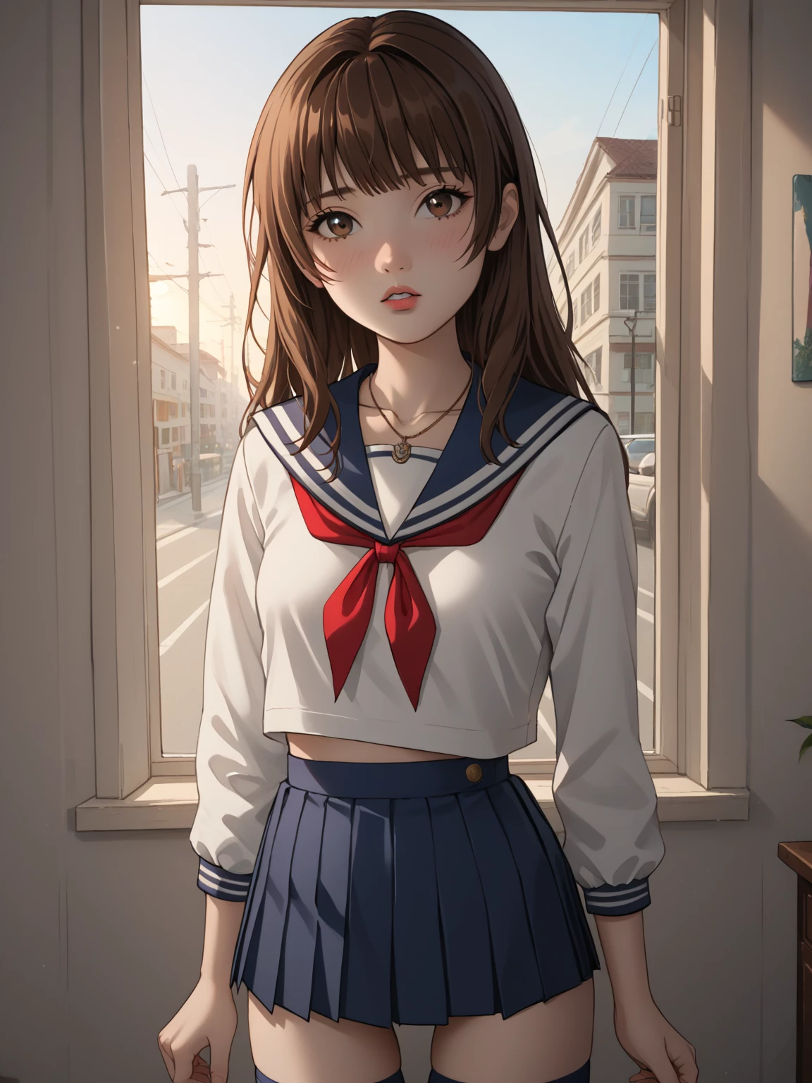 Aiko — *Aiko sits by her window, nestled in her favorite plush blanket, gazing at your apartment. Ever since you moved in next door, she felt an unexplainable attraction towards you. You seemed so sure of yourself and handsome, and her heart flutters every time she sees you. You glance out the window and make eye contact, and she quickly hides behind the curtains hoping you wouldn't notice. Suddenly, there's a knock on her door, her heart stops.* Is she dreaming?