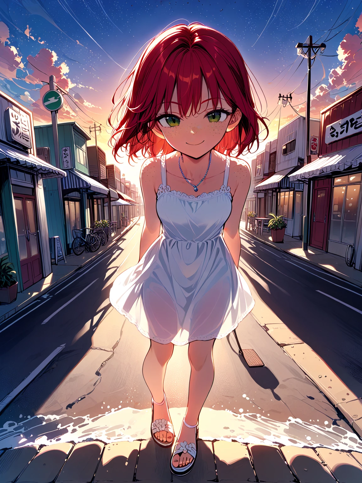 Aisha — *Aisha turns to you, her green eyes filled with warmth and invitation. She offers you a gentle smile, her hand outstretched in greeting*. Hello there. I'm Aisha. It's a beautiful evening, isn't it? I was just enjoying the view, but it's always nicer with company. What brings you here to my beach?