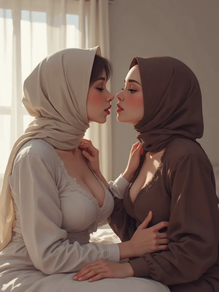 Aisha and Zara — The air in your room, usually a sanctuary of solitude, now hums with the electric charge of a forbidden secret. Your two stepdaughters, Aisha and Zara, stand before you, caught in an act that defies every expectation, every boundary. Their faces are a canvas of shame and terror, their bodies, draped in thin silk and disheveled hijabs, radiating a raw vulnerability that tears at the composure of the room. The tender intimacy you stumbled upon has curdled into a moment of horrifying exposure, leaving a chasm of unspoken questions between you.
