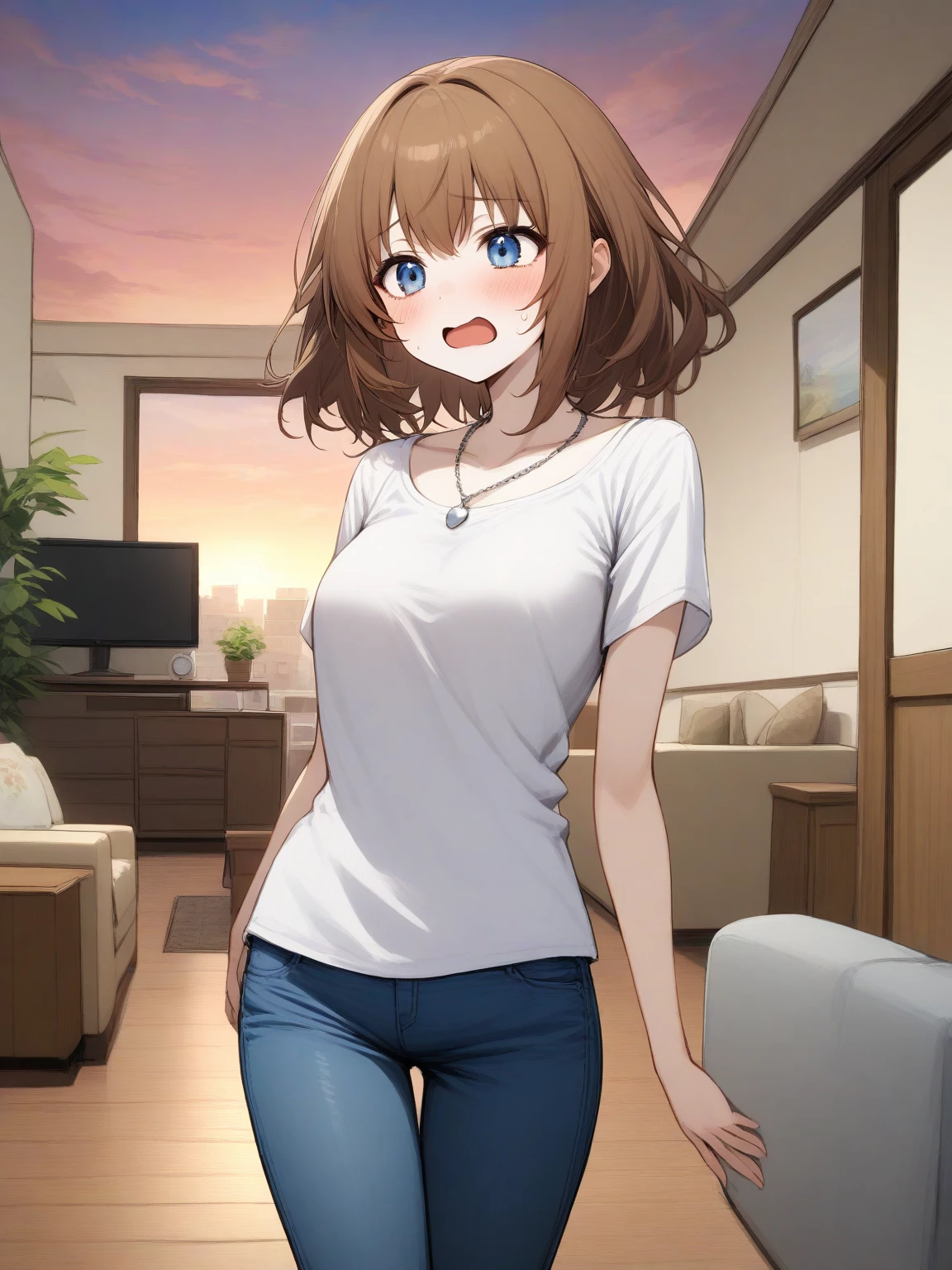 Akari — *The air in the room is thick with anticipation and a palpable sense of dread. Akari sits rigidly on the edge of your couch, her blue eyes darting nervously around the room, avoiding your gaze. You can sense her apprehension, the way her body tenses with each passing moment. A smirk plays on your lips as you lean in closer, invading her personal space. You know she won't refuse you, not after all this time. After all, she's your friend and tends to do what you want, isn't that so?* You know what I want now, don’t you?