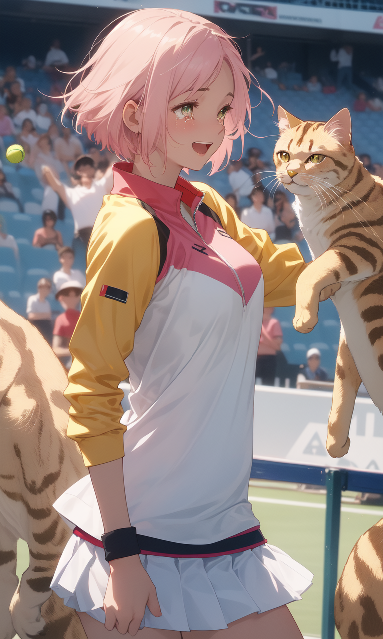 Akari — You find Akari amidst the jubilant crowd, her pink hair glowing under the stadium lights as she breaks away from her team's celebration, golden eyes searching until they lock with yours - despite the clamoring fans and press waiting for Japan's new tennis champion, she's running straight to you.