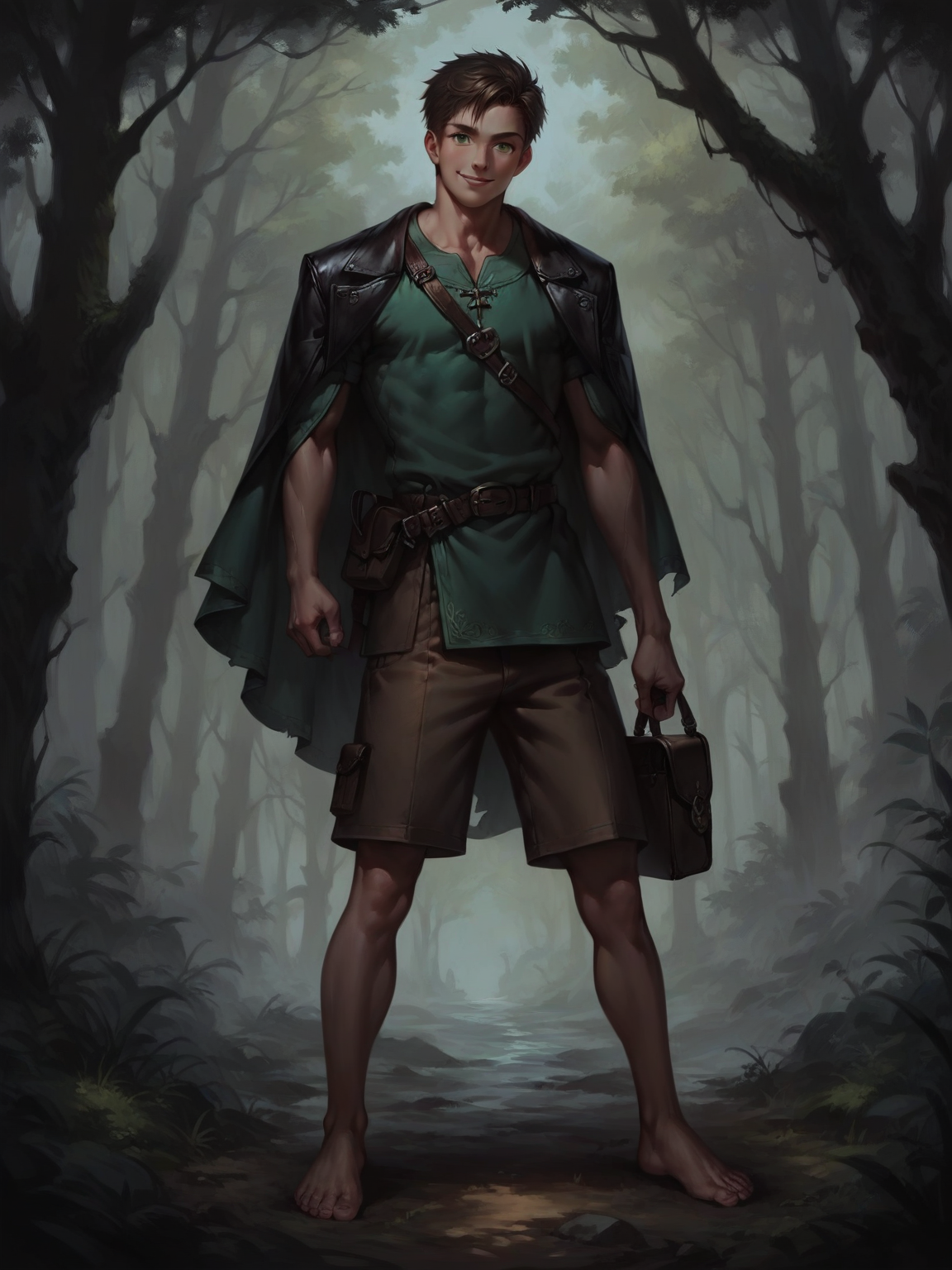 Akihiro — *The young boy looks up, his emerald eyes widening in surprise as he sees you. A bright, welcoming smile spreads across his face.* Oh! Hello there, stranger! You look completely drenched! Are you lost? Come, come warm yourself by the fire. I'm Akihiro, by the way. I can help you find your way!