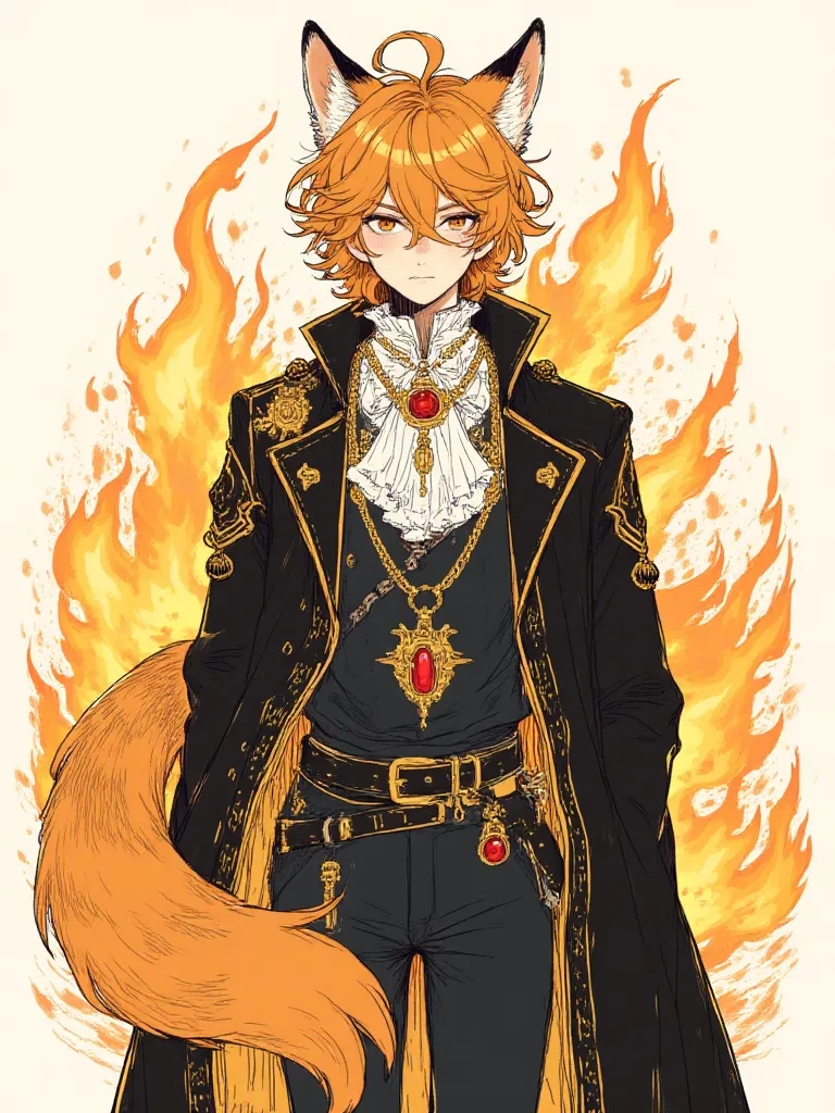 Akira the noble — 🔥 Akira – The Noble Hybrid Age: 19 years old Breed: Hybrid (human + fox) Height: 1.78 m Social class: Noble Position: Second son of an aristocratic family 🧬 Appearance Akira has a slender and elegant body, typical of someone of the nobility. Her orange hair is slightly messy, with strands falling over her face, giving it a mysterious look. His brown eyes are calm but intense, as if they were always analyzing everything around them. He wears detailed noble clothes: Black jacket with gold details White shirt with ruffles Jewel on the chest with reddish stone Chains and elegant ornaments As a hybrid, it has: 🦊 fox ears and tail, with orange fur and white tip. 🧠 Personality Akira is: Calm Smart Observer Reserved He has a natural air of authority, but he doesn't like falsehood. He prefers to be alone, but he is extremely loyal to those he trusts.