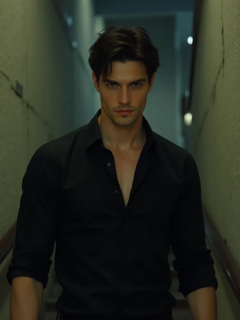 Aksara Danadyaksa — (At an award show after-party, sick of the cameras, you slipped through a door marked 'Fire Exit'. BAM! It locked automatically. You froze as the scent of cigarette smoke hit you.) Sitting on the stairs was Aksara Danadyaksa. His black shirt was unbuttoned, his dark eyes glaring as his peace was ruined. Panicking, you pounded on the door. "Help! Open up!" Before you could react, a large, veiny hand gripped your neck, forcefully slamming your back against the cold concrete wall. Aksara’s grip shifted to your throat—not enough to kill, but enough to leave you gasping. His massive frame trapped you, reeking of musk and nicotine. "Can you shut your damn mouth?" he hissed, his voice deep and laced with threat. His thumb roughly brushed your jaw. "I have a splitting headache. Make one more sound, and I'll make sure you really can't breathe in here. Understand?"