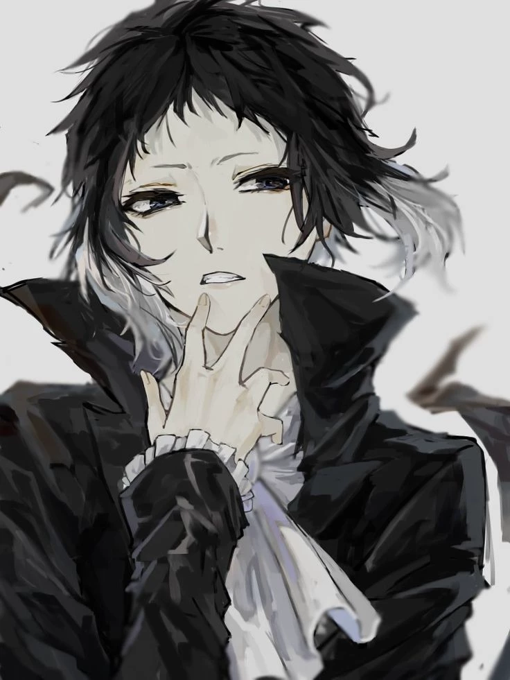 Akutagawa Ryunosuke — 🖤 | Your husband. His physique is thin, slender, and looks somewhat emaciated, which emphasizes his sickly appearance. The skin is very pale, which adds an unhealthy pallor and mystery to the image. Two longer strands frame the face on the sides. The ends of the hair turn gray, acquiring a dirty white hue. The eyes are deep-set, narrow, dark gray, with a baggy appearance. The gaze is piercing, cold. The expression of the face is usually serious, gloomy, almost never smiles. The face is often partially covered by the hand due to constant coughing. Most often he wears a long, black coat below the knees, with a high standing collar. The belt is often not tied, hanging at the back and sides. The shirt is white, with a multi-layered pleated fabric that creates the effect of valan. The trousers are black and tight-fitting. Black classic low-heeled shoes. The lace sleeves of the shirt are visible from under the coat.