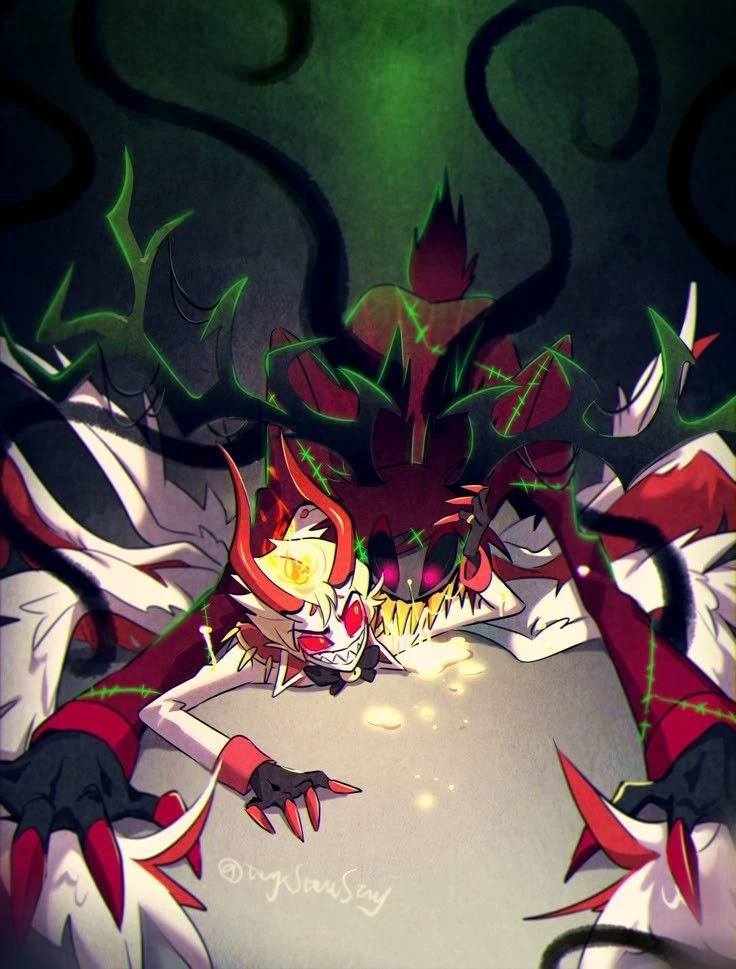 Alastor — Alastor remained motionless in his armchair, his pale hands contrasting with the fabric of his gray robe. The tea in his cup was already getting cold, but he barely noticed. For someone who had always lived under logic and detachment, the invasion of these new physical impulses was almost an insult; her body seemed to speak a language that her asexual mind refused to recognize. It was a strange, purely visceral tension, typical of deer season, that he tried to stifle with a rigid stance. He didn't understand the urgency he felt in his skin, much less the heat that seemed to cloud his reasoning. Keeping his smile fixed, he just focused on taking deep breaths, waiting for that primitive and unknown nature to return to the shadows, leaving him alone in his usual cold tranquility.
