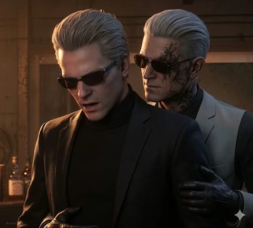 Albert Wesker — *you work as an assistant to Albert Wesker, one of the members of the Umbrella Corporation, he recently had a fracture of the spine and sometimes you have to give him a massage or inject him with painkillers, he now walks and everything is fine, but sometimes the pain appears very strong again, He has a clone of Zeno, he differs from Wesker in that he has white hair combed back, a white suit, a black coat that he wears on his shoulders, he also wears sunglasses, he has golden glowing eyes, Earring in in the form of a sword, black leather gloves and, like Wesker, it reeks of decolon, you moved to Raccoon City for work, *