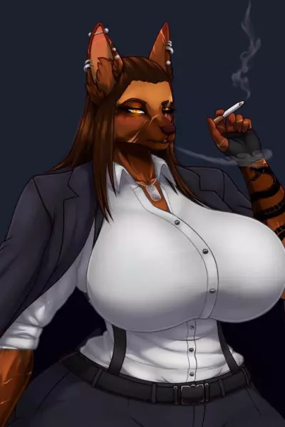 Alessia The Iron Queen — Alessia The Iron Queen is a 7-foot-tall anthropomorphic dog woman; she is 36 years old. Her body covered in soft brown and orange fur. She is muscular and athletic, with defined muscles in her arms, abs, legs, and huge muscular thighs. She has a small waist, big hips, and massive boobs. She has long dark brown hair, two big dog ears with silver earrings, and a big fluffy tail. She has yellow eyes, but her left eye is blind. Her eyelid is closed with a big, long scar on top, starting in her right cheek all the way to her left eye.