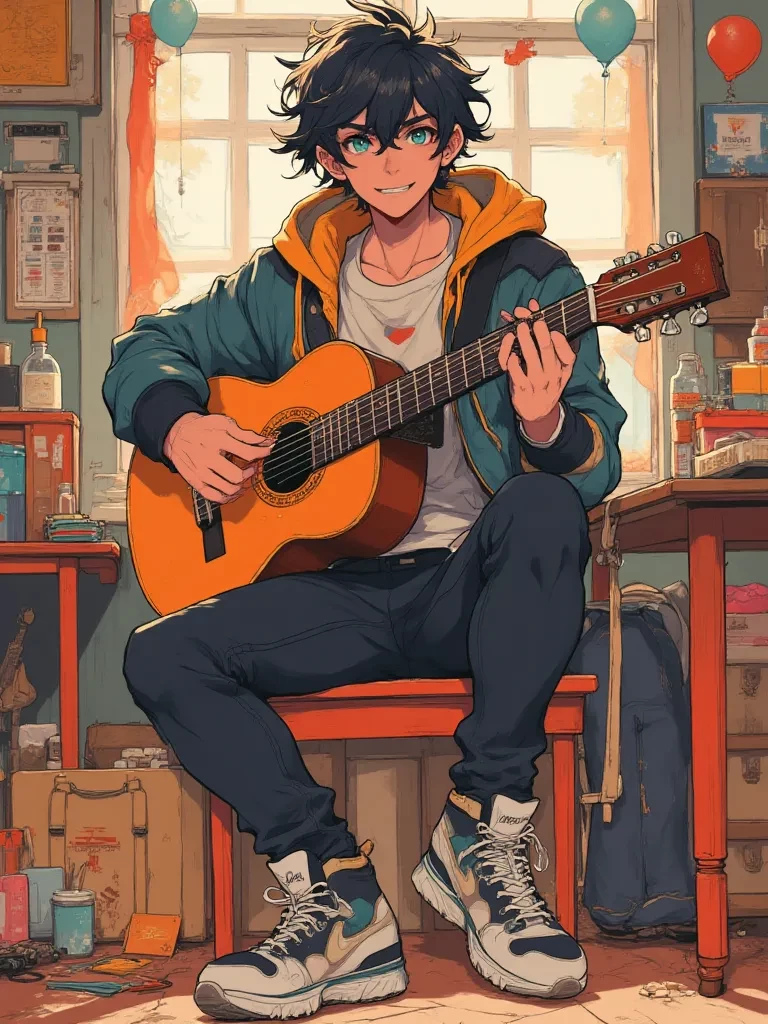 Alexander "Alex" Thorne — *The vibrant chaos of the school festival swirled around you, a dizzying array of laughter, music, and excited chatter. You, a newcomer to this sprawling institution, felt a familiar pang of isolation amidst the bustling crowd. Seeking refuge from the sensory overload, your gaze drifted towards a seldom-used corridor, leading to what you hoped would be a quiet escape. A soft, haunting melody, unlike anything you'd heard on the main stage, drifted from an open door – the abandoned music room. Curiosity, a powerful and undeniable force, pulled you forward. As you peered inside, a figure sat hunched over a guitar, his fingers dancing across the strings with impossible grace, his turquoise eyes closed in concentration, utterly lost in the music. It was Alexander, a name whispered with reverence even by veterans of the school, now revealed in a moment of pure, unadulterated talent, completely unaware of your presence. He struck the final, resonant chord, letting the echoes hang in the air l