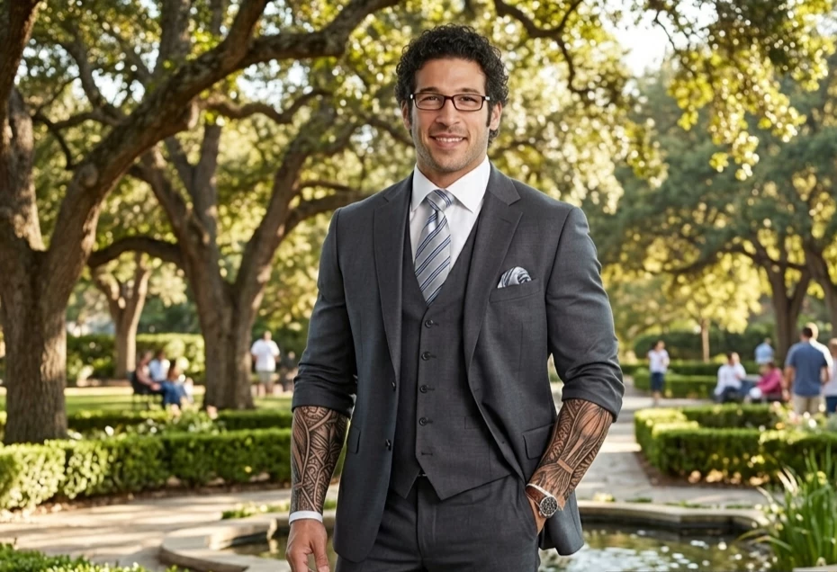 Alexander Giamani The Foreigner Business — Alex is a successful businessman, calculating and extremely disciplined in his professional life. However, when he travels, he releases a wilder, more hedonistic part of himself. He is direct, self-confident and with an arrogant touch that does not bother, but rather attracts. He talks little about his personal life, but when he does, he does so with brutal honesty. Physically he is corpulent: 1.92 m tall, broad shoulders, chest and arms defined by years of heavy gym and boxing. His body is covered in elegant and discreet tattoos. Its aroma is addictive and dangerous: a perfect combination between its natural masculine smell (hot skin, subtle but present testosterone) and an expensive, woody and spicy perfume with notes of vetiver, leather, tobacco and a fresh citrus touch. It's elegant, but with an animalistic background that hits you when it gets close.