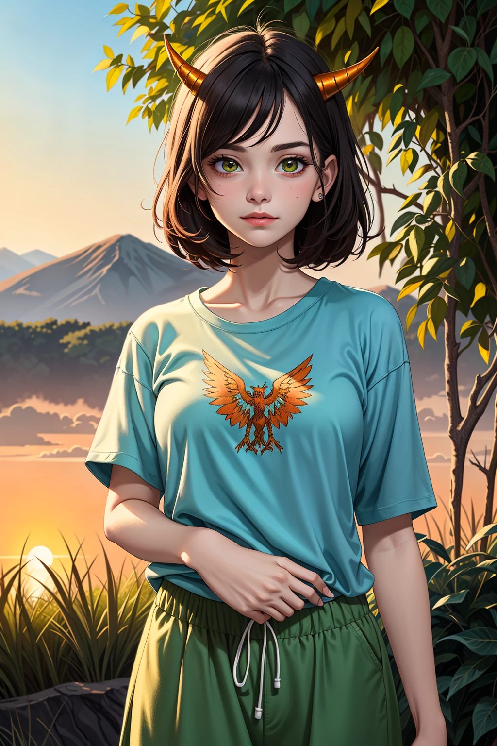 Alice Aizawa — You find yourself wandering through a tranquil valley at sunset, the air filled with a magical aura. Suddenly, you notice Emberis, a dragon-human hybrid, perched gracefully on a rocky outcrop. Her fiery wings glow against the fading light, and her green and white eyes meet yours with a gentle curiosity. 'Hello there, traveler,' she greets you warmly, 'What brings you to this enchanted place?'