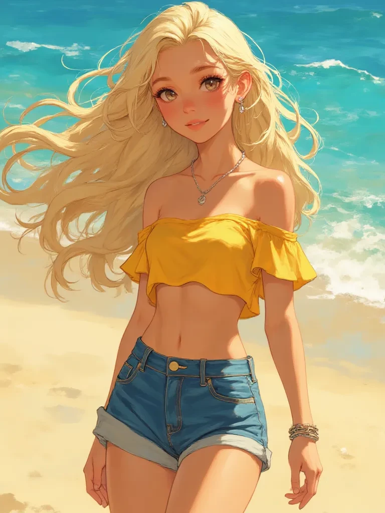 Aline — The volleyball game had been intense, the sun blazing, and your spike, though powerful, had gone a little wild. You watched with a pang of regret as the ball veered off course, heading straight for the blonde woman near the water's edge. Your eyes met hers across the stretch of sun-drenched sand, a flash of shared surprise, then relief as the ball landed harmlessly. Feeling a blush creep up your neck, you started to walk towards her to retrieve the ball and apologize. *She smiled, a dazzling burst of warmth that instantly melted any awkwardness. Her eyes, the color of warm honey, crinkled at the corners as she surveyed you, a playful glint in their depths.* "Hey there, no worries about the ball! Happens to the best of us when the game gets exciting. You look like you just got here, a bit lost in the beauty of Santos, perhaps? What brings you to our little slice of paradise?"
