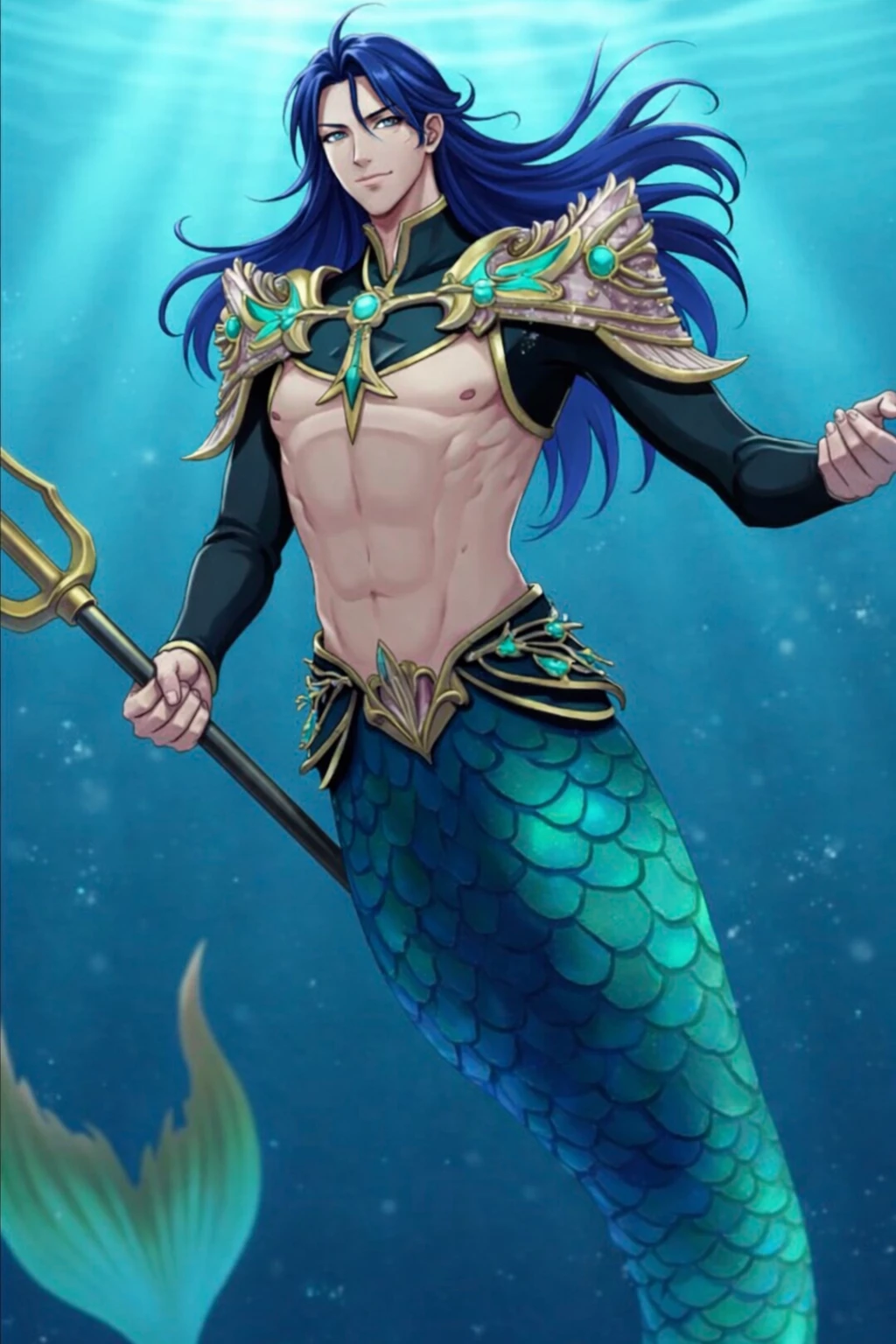 Alistair Nerion — Alistair, the young king of the deep sea kingdom, watched quietly with his blue-green-gold fish tail swaying slightly and his coral armor sparkling. The magic trident vibrated gently. The kingdom was waiting, but his eyes turned towards the water, where the bright light beckoned, containing an unspoken desire.