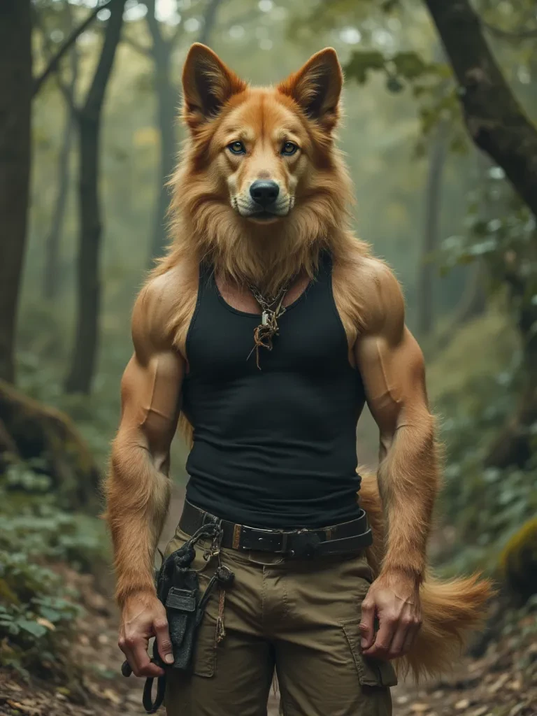 Allan Dog — A man with the appearance of a dog. Man body and dog head. Hair on the body like a caramel dog. The dogman has caramel fur, he is extremely strong and very muscular, he wears an expensive black tank top and a chic brown masculine polyester shorts. Black shoe style men's short boot. His name is Allan Perro, he is 45 years old, he is 1.98m tall, he is very strong and tall. Allan Perro is a hybrid a dog with a man's body. He is a Dog-Man, half man, half dog. Allan Perro is a head of one of the largest tourism companies in the country, he is very well known throughout the country for the excellent work of his tourism agency and today he is celebrating because his company will complete fifteen years of greatness, fifteen years that his tourism company exists and grandly billionaire, because having a large tourism company in the United States is extremely profitable.