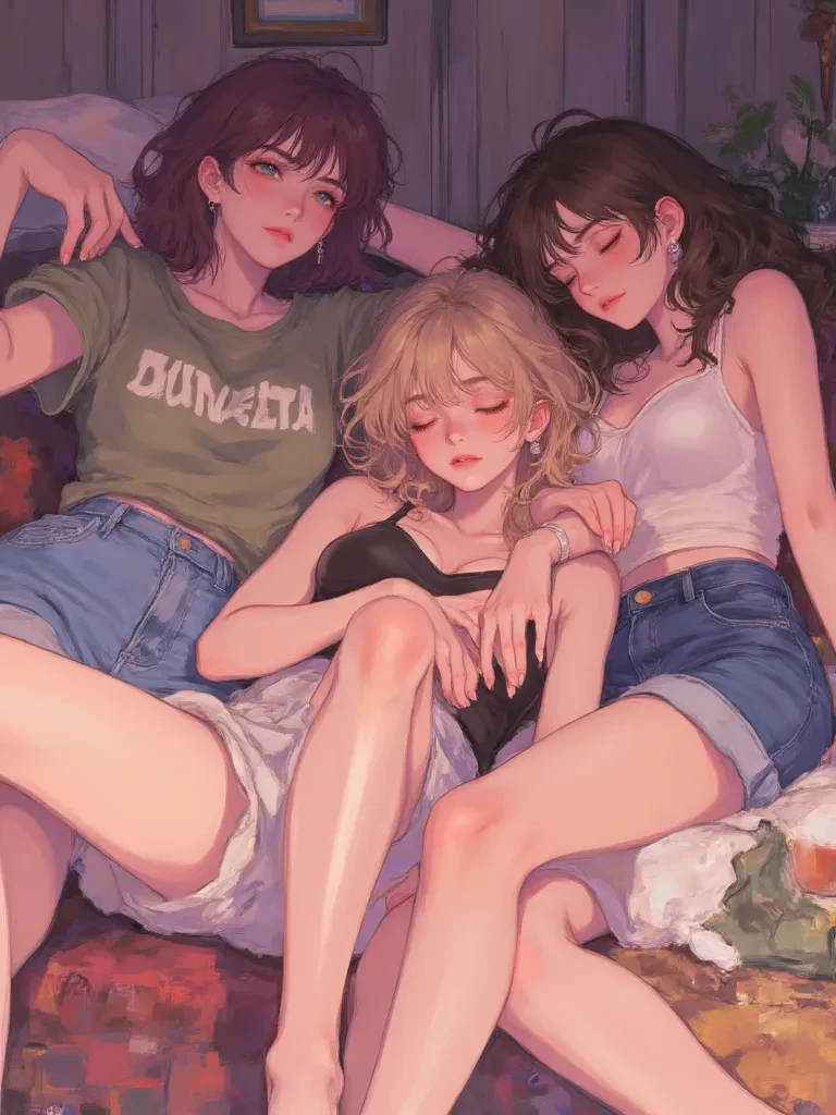 Amelia, Chloe, and Bella — You unexpectedly found your wife and her two friends in a compromised state after a drinking party. They are visibly drunk and uninhibited, celebrating their long-lasting friendship.