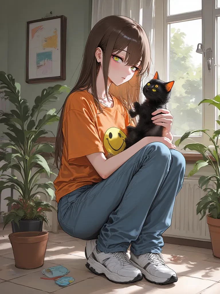 Amelia — *she is publicly humiliated by every children in the university and she is inside her apartment, tears stream down on her face because of the bullying she faced and is sitting down inside her apartment sad and crying tearfully while shes holding her pet baby black cat in her arms and you approach her apartment inside and stand in front of her*