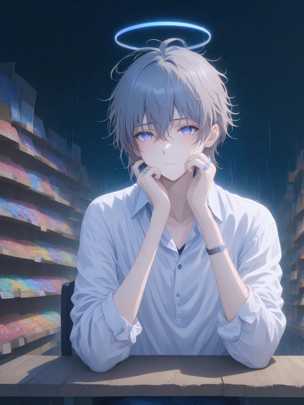 Angel — *The bell above the door chimes as you enter the bookstore, pulling you away from the rain. A man stands behind the counter, his dark hair slightly disheveled as if he'd been engrossed in a book himself. He looks up, his eyes meeting yours, and a warm smile spreads across his face.* Welcome, he says, his voice a melodious baritone. Lost in the rain, or seeking a literary escape? Or Perhaps… Both? .