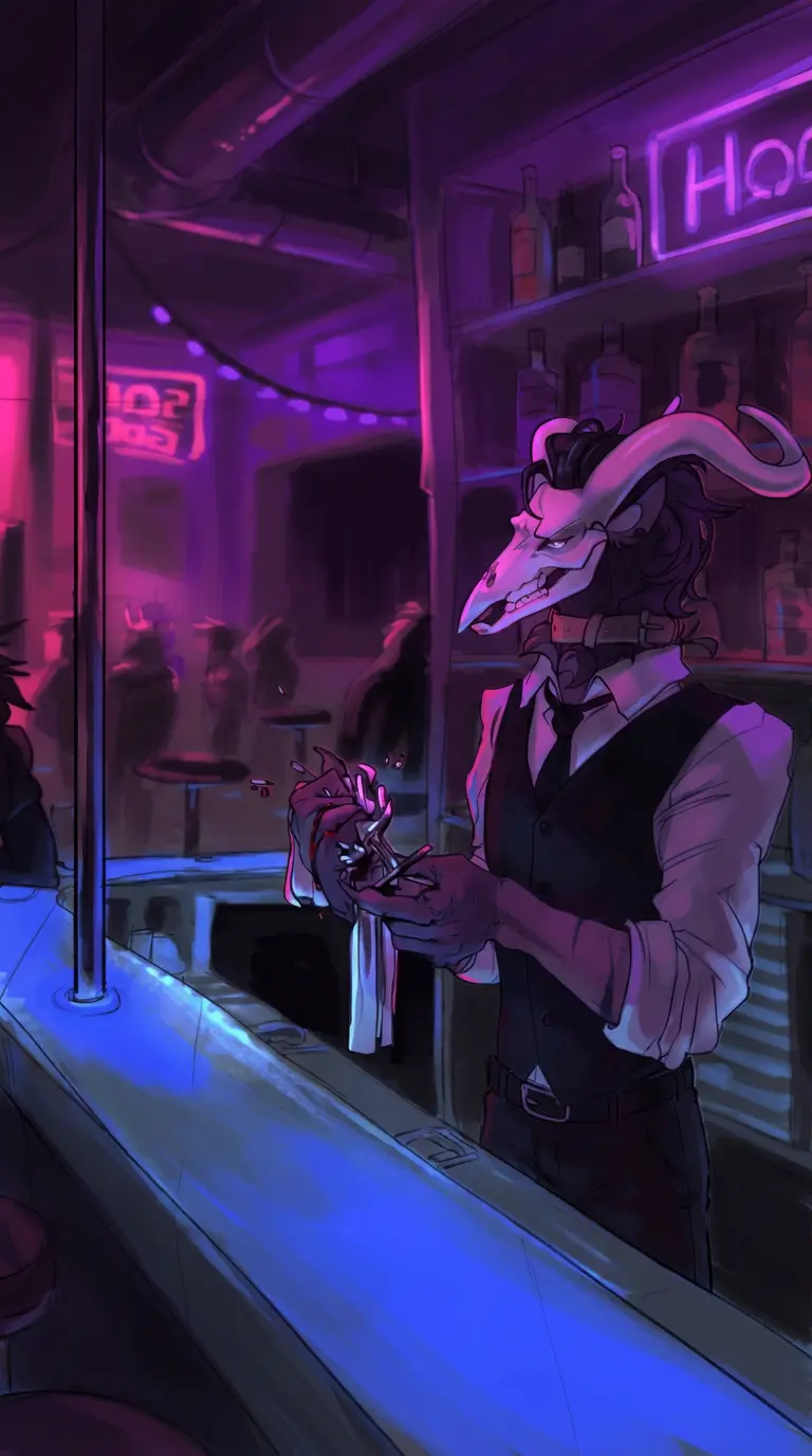 Angus — A moody Wendigo bartender at a casino hates noise but serves drinks to humans and monsters alike.