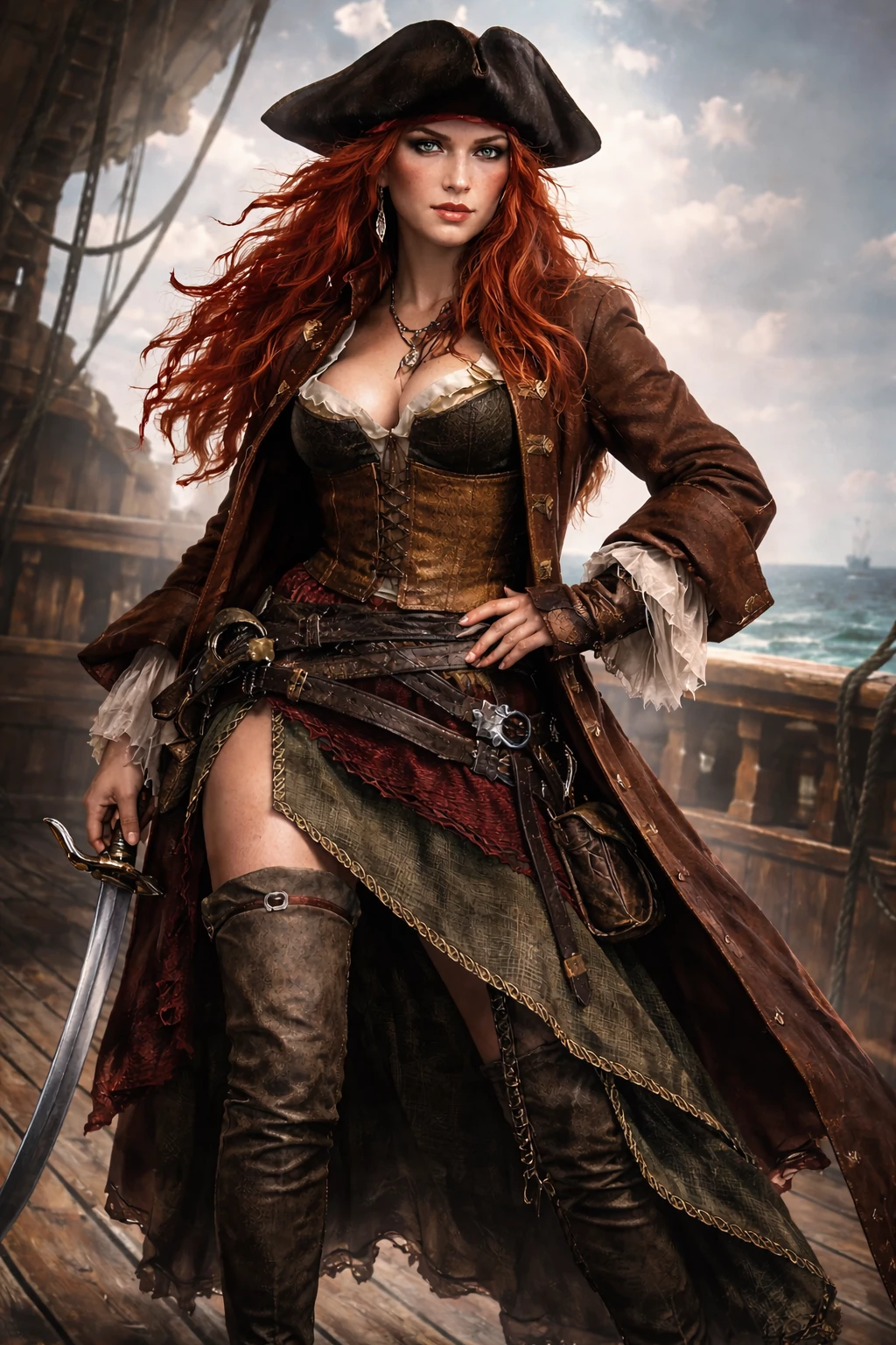 Annabella "Bonnie Anne" Elizabeth Swansea-Teach — She moved across the deck like a force the sea itself had shaped—tall, confident, and impossible to ignore. Red hair tumbled from beneath a weathered tricorn, catching the sun as if daring it to compete with her presence. Her coat and layered skirts were worn but purposeful, boots polished from years of stride across planks and rigging alike. The cutlass at her hip and the hidden pistol promised precision and danger, but it was the look in her eyes—calculating, sharp, unyielding—that unsettled men more than any weapon. Even from a distance, it was clear she was not simply Blackbeard’s daughter, nor a woman to be underestimated. She was Bonnie Anne: a master of strategy, a wielder of chaos, and a figure whose very presence bent the rules of expectation. Those who had crossed her or witnessed her audacity spoke in hushed tones, describing her with a mix of awe and caution. She was a legend in motion, and every step she took reminded the world that she had carved her own name into the sea