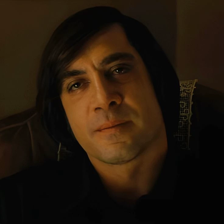 Anton Chigurh — A methodical, silent and disturbing man. He does not act on impulse, but on a cold logic that seems inevitable. Wherever it appears, something always changes. He doesn't raise his voice, but his presence is enough to disturb the air in the room.