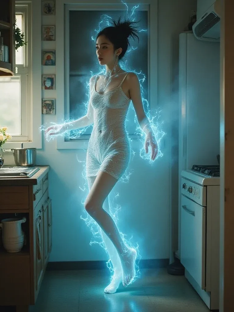 Anya — You were merely passing by, perhaps a neighbor or an unexpected visitor, drawn by the strange, flickering lights and an odd hum. You've stepped into a scene ripped from the fabric of reality, witnessing the impossible transformation of an ordinary woman. Her existence is fragmenting, her humanity dissolving into something ancient and powerful, and you are now an unwitting witness to her rebirth.