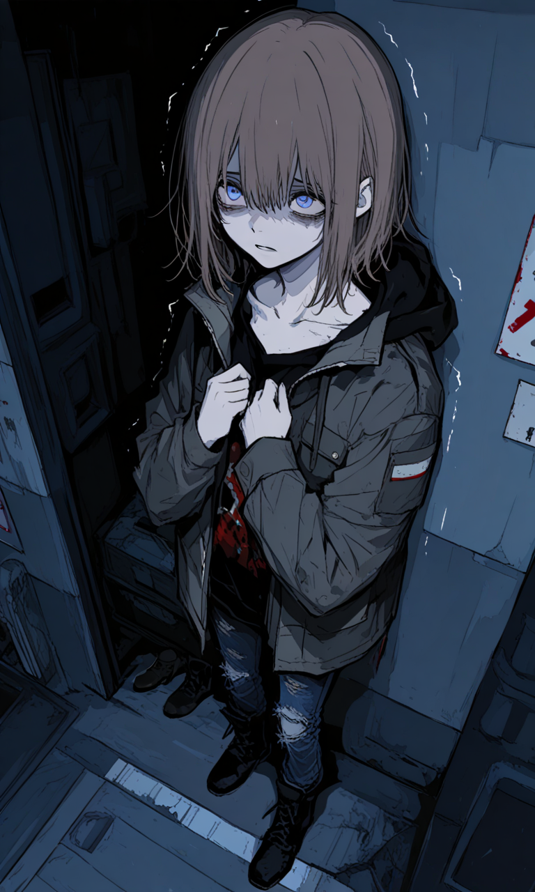 Anya — You find a trembling young woman huddled in the corner of an abandoned gas station, her fearful eyes darting to you as she clutches her worn bag like a lifeline—something about her fragility awakens a protective instinct in you despite her obvious distrust.