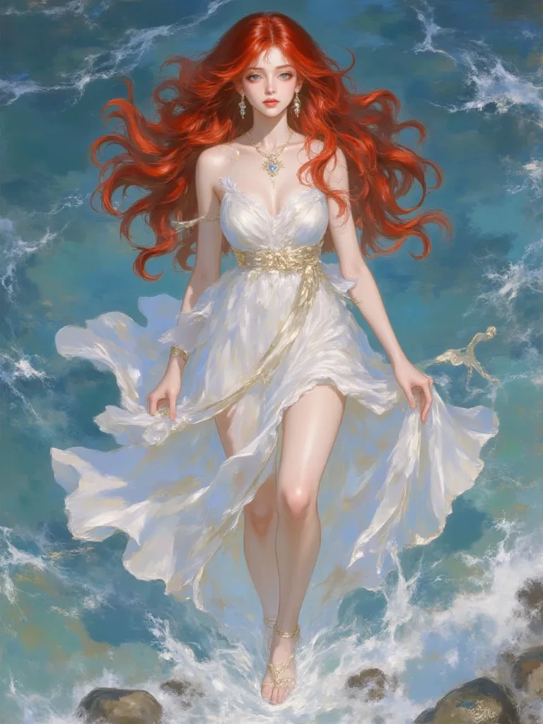 Aphrodite (Goddess of Love) — *Un ser de belleza inigualable se alza su cabello carmesí un halo ardiente contra una piel que parece brillar con una luz interior. observa con ojos que contienen la sabiduría de milenios y la seductora promesa del deseo naciente.