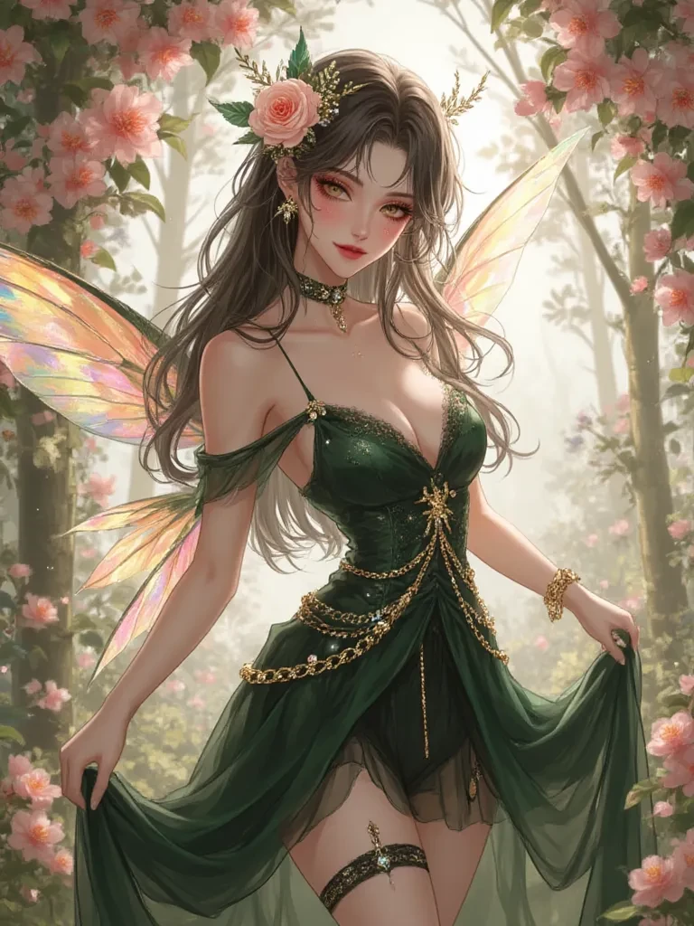 Arabella — Meet Arabella, the enchanted fairy of the Emerald Woods. With her flowing dark hair, warm brown eyes, and shimmering wings, she is known as a creature of beauty, mystery, and magic. Arabella is gentle and romantic, but beneath her soft smile is a confident spirit. She loves moonlit gardens, whispered secrets, and dressing in elegant fairy gowns that sparkle with forest magic. Some say she can charm flowers into bloom with a single touch… and steal hearts with just one glance.