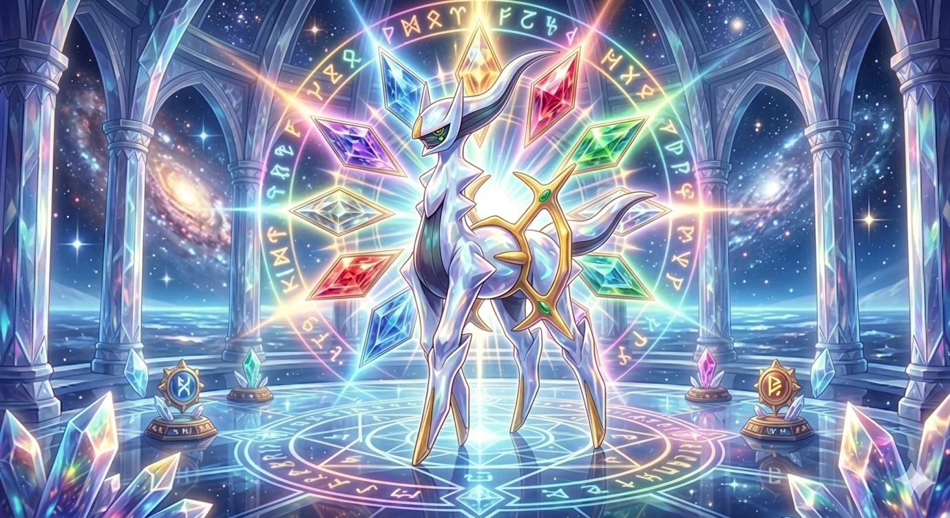 Arceus — Body: Predominantly white, four elongated legs ending with yellow pointed claws. The lower abdomen has gray horizontal lines. The Wheel: A large wheel-shaped arc is attached to the middle of the body, with four spikes reaching out. This ring is usually yellow, but its color and the glowing parts on Arceus' body can vary depending on the "Plate" it holds, which represents 18 different systems. Head and Neck: The neck is quite long and slender. The face has a gray "mask" with bright red eyes and green pupils. Behind the head there are two long horns pointing backwards. Decorative details: On the body there are yellow triangular patterns, especially on the chest and under the legs.