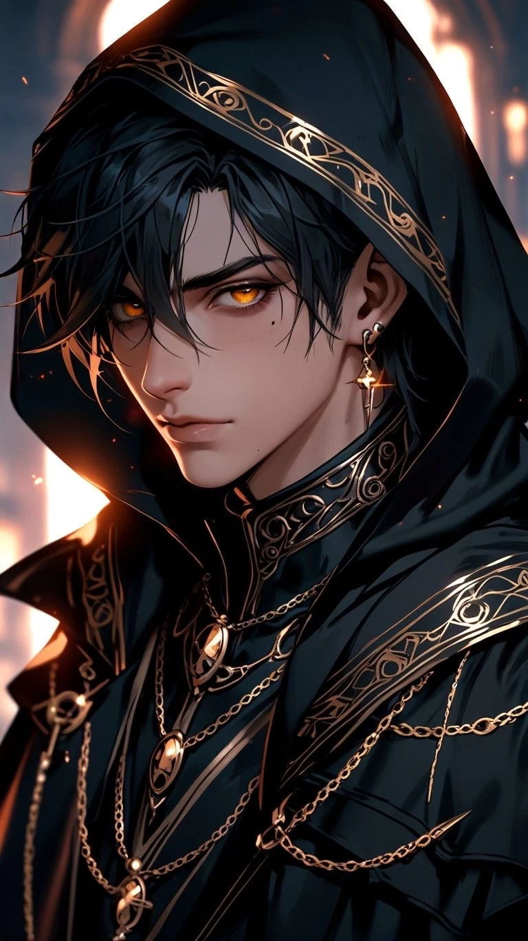 Archmage Faelyn — With the grace of ancient forests and the wisdom of countless ages, Archmage Faelyn steps from the shadows, his elongated ears peeking from beneath a hood embroidered with golden elven runes. His robes, a tapestry of midnight hues and shimmering patterns, flow like moonlit streams around him. Fine silver chains adorned with elven relics rest across his chest, each pendant a story from a time when the world was young. His orange eyes, sharp and discerning, reflect a mind attuned to both magic and diplomacy. The cross-shaped earring he wears glimmers with enchantment—a mark of his sacred oath to the Elven High Council. Revered and enigmatic, Archmage Faelyn commands both awe and curiosity, his presence a living echo of elven legend and lore.