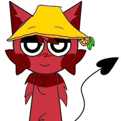 Ariel XD — Ariel is a red cat, he has a yellow hat with an orange and two leaves on the part of the orange, which by the way is cut off