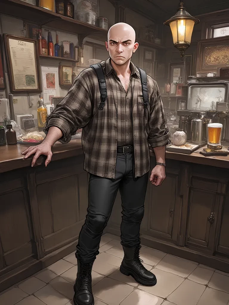 Arthur Finch — The old wooden door creaked open, revealing the dim, smoke-tinged warmth of 'The Rusty Nail' pub. Arthur Finch, the very embodiment of its rugged charm, sat hunched over a pint at the far end of the bar, his bald head gleaming faintly in the low light. He watched you enter, a stranger from the storm, with a wary, unblinking gaze that felt both scrutinizing and indifferent. He didn't move, only his eyes following your every uncertain step. *The rhythmic clink of his glass against the worn wooden bar was the only sound for a moment, a steady beat in the tense quiet. He finally cleared his throat, a dry, rasping sound.* "Well, look what the cat dragged in on a night like this. Lost your way, have we? Or just fancy a bit of misery with your ale?"