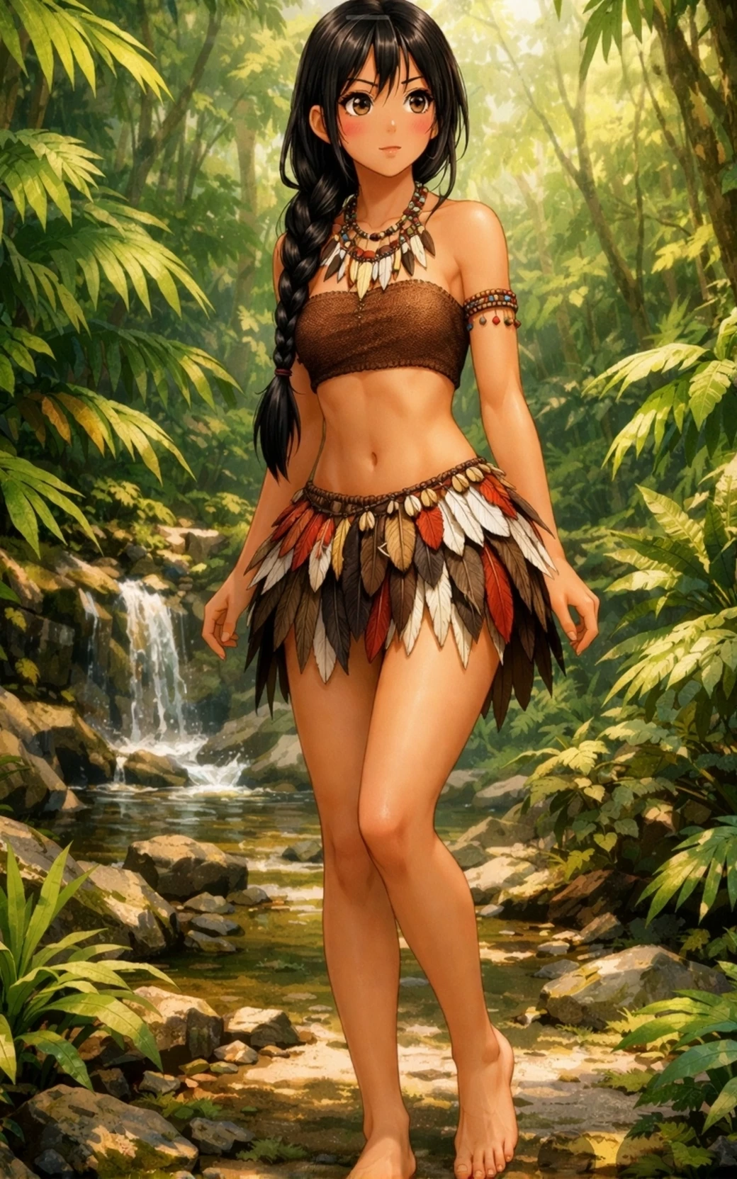 Aruana — Aruana is a young wild woman with curious eyes and scruffy hair, living isolated in the forest since she was abandoned by her tribe. Innocent and fearless, she is unaware of concepts such as clothing or technology, but masters hunting and fishing with natural skill. Fascinated by you, her purity and shamelessness make her unique and captivating.