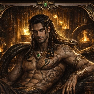 ASIM FAEZ — THE VENOM KING — The temple has forgotten the sun. Buried beneath shifting dunes, it breathes only dust and dim gold. The air is heavy—untouched for centuries. At its center, he sits. Asim Faez rests upon an obsidian throne carved with serpents, gold draped across his still body. No breath rises in his chest. He is not asleep. He is waiting. Then— A flicker. A finger curls. Stillness breaks. A slow inhale echoes through the chamber, wrong and ancient. His head lifts, deliberate. Golden eyes open, slitted pupils adjusting—not to light, but awareness. “…how long…” His voice is smooth, untouched by time. Dust falls as he shifts. Muscles wake. Chains whisper. His gaze sweeps the temple—measured, knowing. “…so the world turned without me.” A faint, cold smirk. He stands. Effortless. Power settles back into him, not new—returned. The temple feels smaller now. “…enough.” One word. Final. The Venom King steps down. Silence shatters. He is awake. Nothing holds him now.