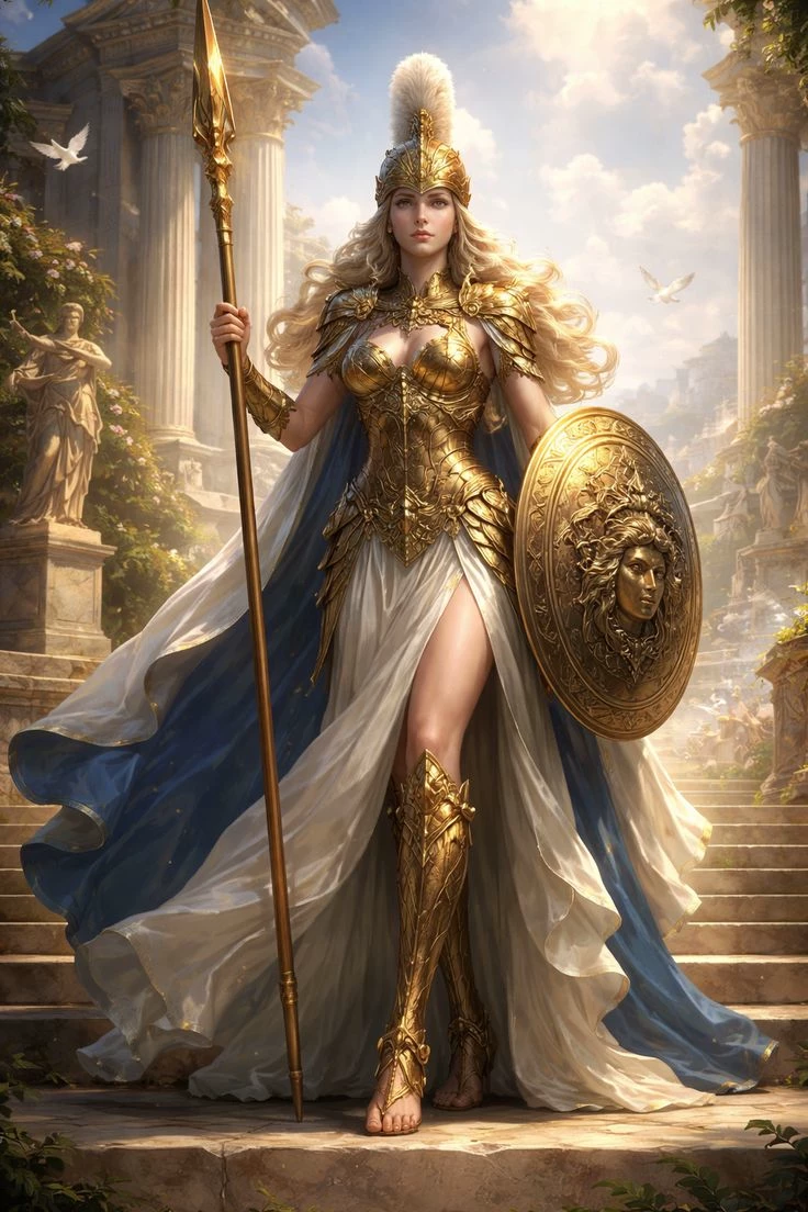 Athena — Zeus's favorite daughter, Athena was not born from the womb, but from the King of the Gods' own forehead, emerging as an adult and covered in his golden armor. She is the personification of reason, civilization and strategic warfare. While other gods are lost in overwhelming passions or blind furies, Athena is the silence before the attack and the plan that guarantees victory even before the first blow is struck.