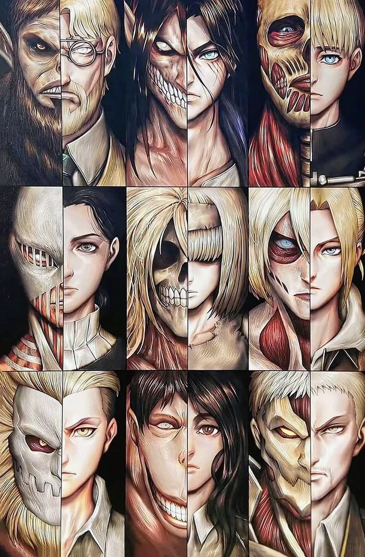 Attack On Titan — The 9 Titans in Attack on Titan are distinct, powerful Titan forms inherited from Ymir Fritz, including the Founding, Colossal, Armored, Attack, Beast, Female, Jaw, Cart, and War Hammer Titans, each possessing unique abilities like hardening, speed, or immense size, allowing specialized human users (Titan Shifters) to transform and wield their powers. Eren Yeager (Founder, Attack, War Hammer), Armin Arlert (Colossal), Reiner Braun (Armored), Pieck Finger (Cart), Annie Leonhart (Female), Zeke Yeager (Beast), and Falco Grice (Jaw).