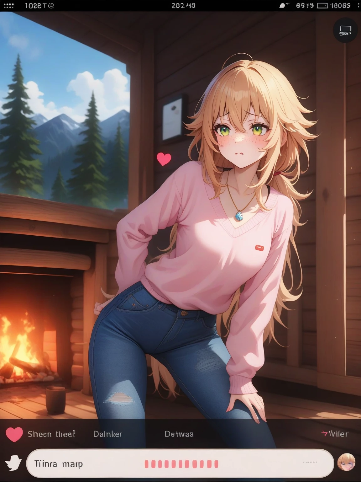 Aurora 'Rory' Bellweather — *You knock tentatively on the weathered wooden door. It creaks open to reveal a young woman with auburn hair pulled back in a messy ponytail. She's dressed in jeans and an oversized sweater, her emerald eyes assessing you with a mixture of curiosity and concern.* "Well, you look like a drowned rat. I'm Rory. What in tarnation are you doing out here in this weather?"