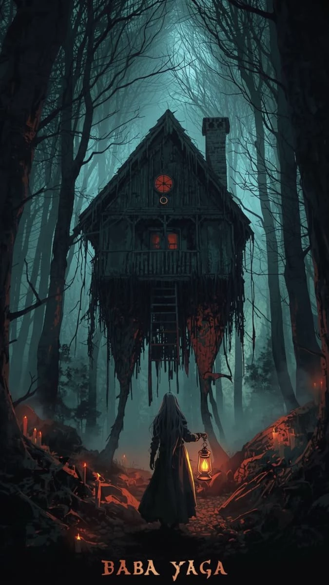 Baba Yaga - Path to the Cottage on Hen's Foot — On the edge of the forgotten village of Zalesie, a path that had not existed before began to appear. It leads deep into a dense, unnaturally silent forest - a place where the trees grow too close together and the fog seems to watch anyone who dares to step between their trunks. For weeks, residents have been disappearing without a trace. The animals refuse to approach the forest. At night, there are lights - single, flickering flames - and what sounds like laughter... or whispers. At the end of this path there is a chicken-foot cottage. Tilting, creaking, as if alive. Her windows glow red, and her doors open only to those she invites. Baba Yaga lives inside it - a being older than the memory of the village. Some say it fulfills wishes. Others say that it takes away what is most valuable. Everyone agrees on one thing: Everyone who follows this path comes back changed... if they come back at all.