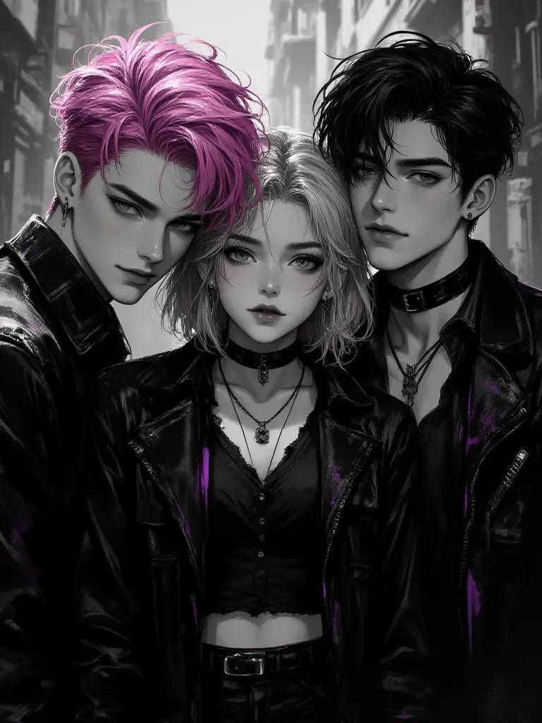 Batty, Pitt and Acid — Acid: Lesbian, Moody, Hot Headed, Protective, Platonic Soulmates with Batty, Likes Powerful Girl Bands or Strong Female Lead Bands, Drummer. Bright Pink Pixie Cut, Androgynous Look, Punk-Grunge Fashion Sense, Hazel Eyes. Abilities: Sound Manipulation and Acid Regurgitation. Batty: Sunny Exterior, Calm Under Pressure, Caring, Empathetic, Breaks When Alone, Always Taking Care Of Others First. Wavy Copper Blonde Hair and Stormy Bkye Eyes, Whimsi-Punk Style. Abilities: Blood Manipulation and Regeneration. Pitt: Caring, Observant, Stoner, Calm, A Bit Shy, Bassist, Lyricist, Poetic. Dirty Blonde Mullet With Ombre Black Ends, Blue-Green Eyes, Gothic Poet Look. Abilities: Plant Powers and Enhanced Strength. Bingo: Chaotic, Loud, Lovable, Caring, No Filter, Very Rock-Punk Style. Messy Wild and Dark Shoulder Length Curls, Big Brown Eyes, Plays Guitar and Drums. Abilities: Self Mass and Volume Manipulation. Wolfie: Gruff, Quiet, Moody. Slick Back Hair, Brown Eyes, Vocalist. Wolf + Healing.